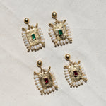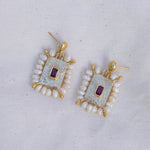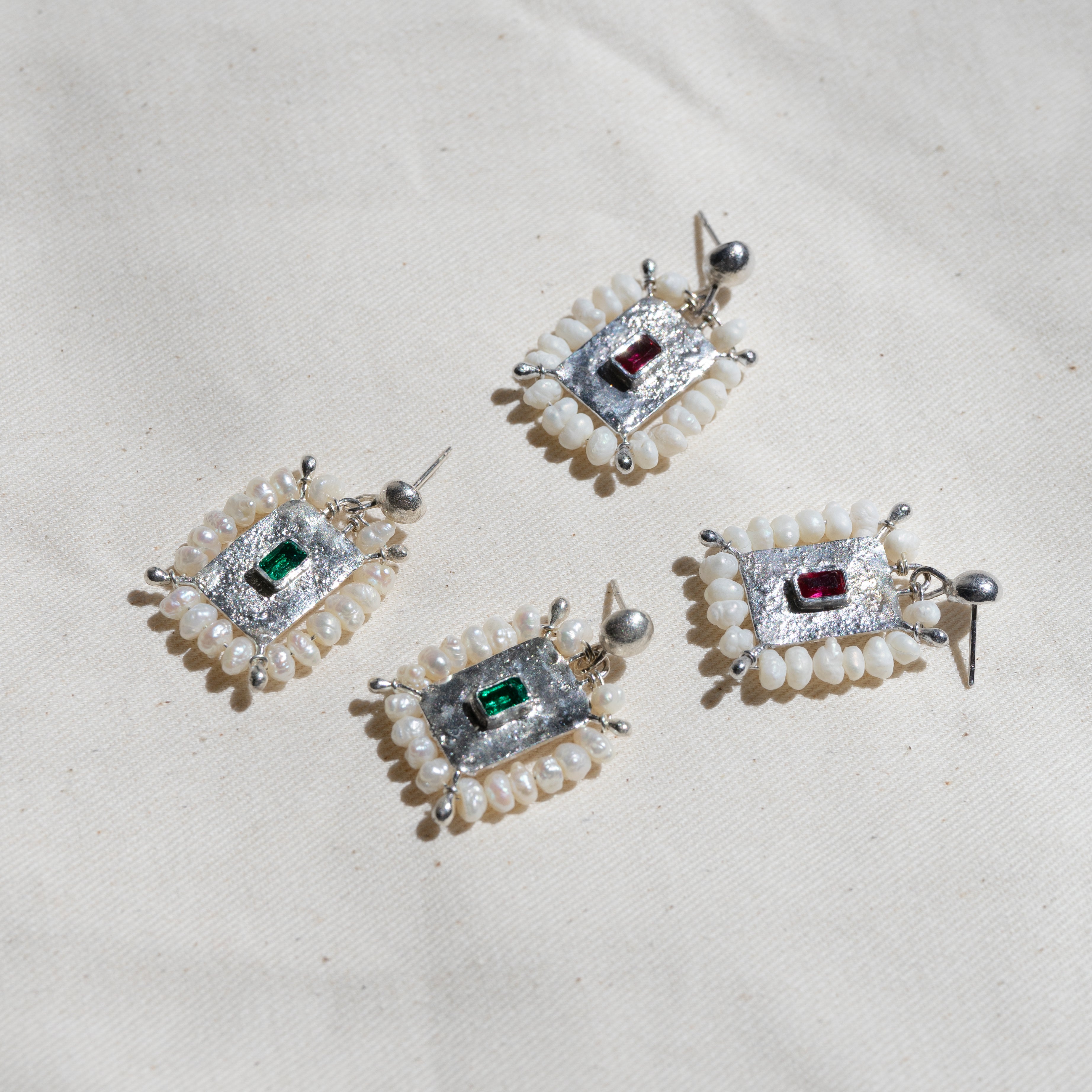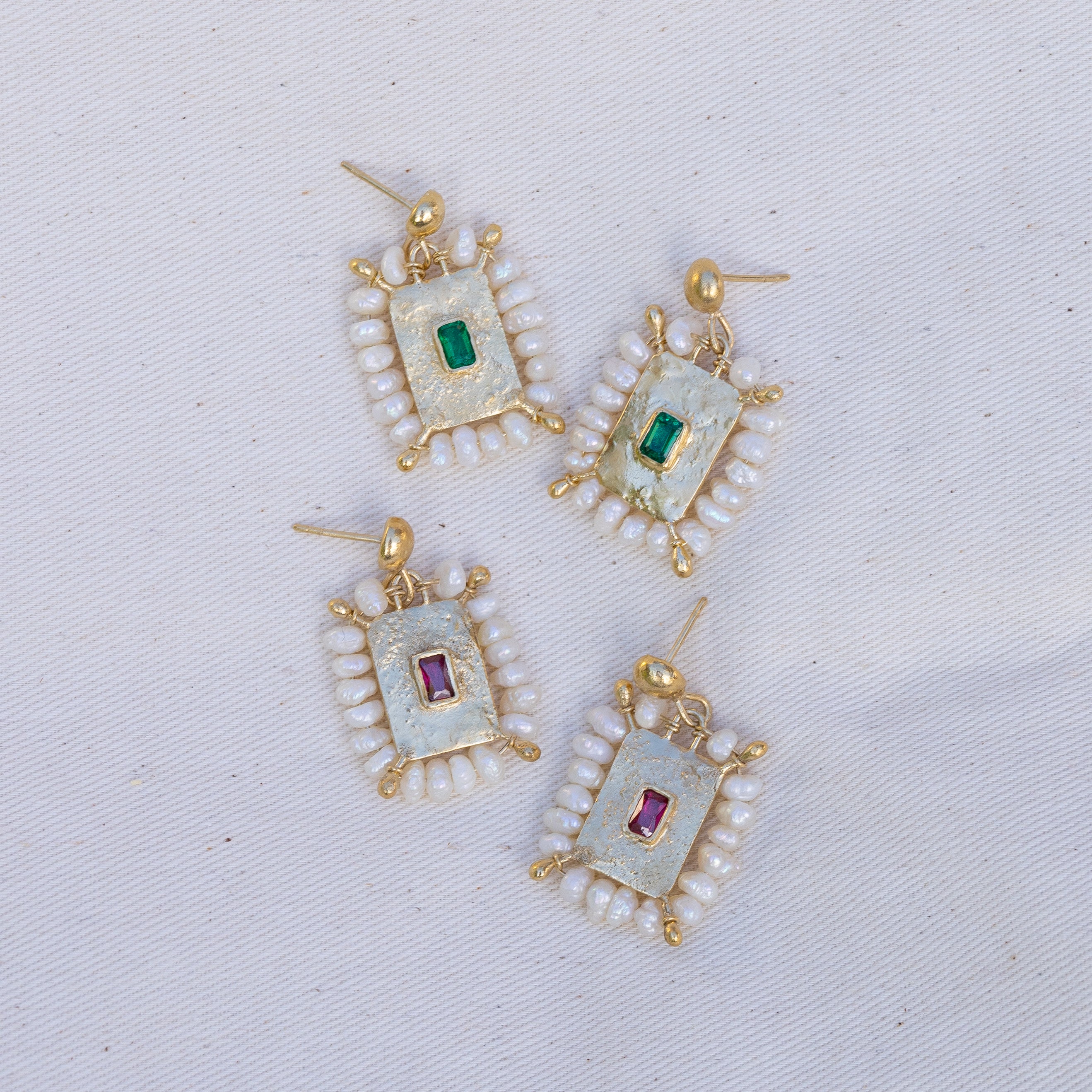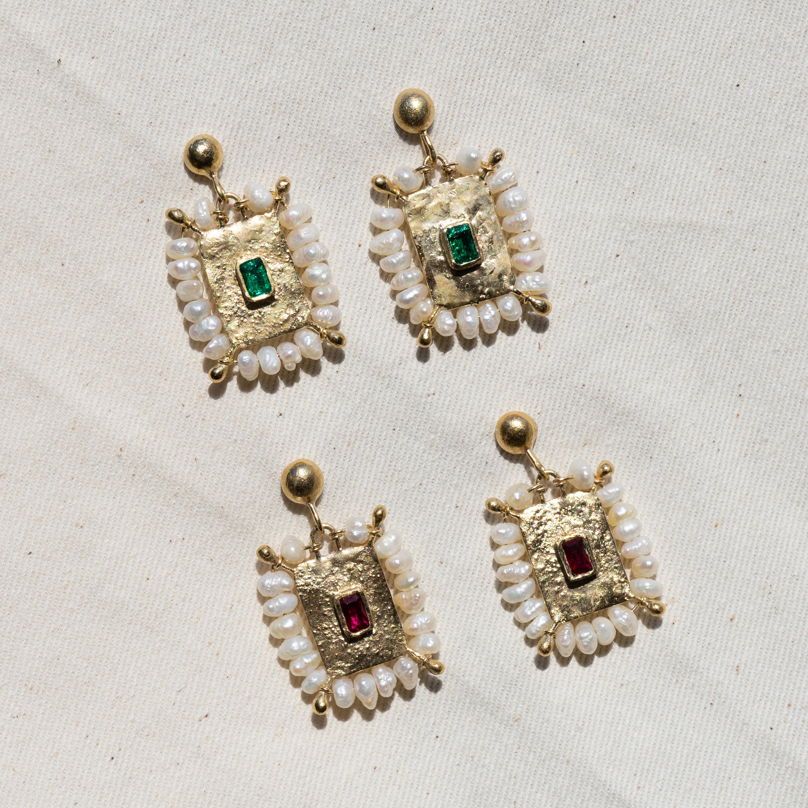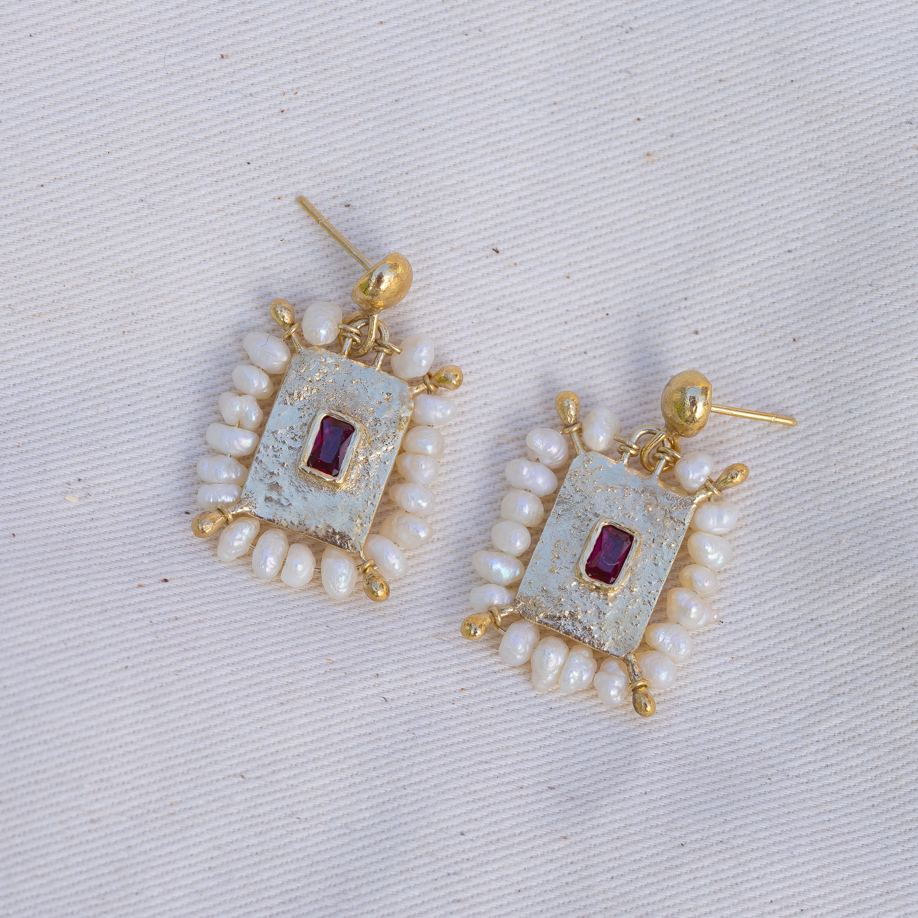 A delicate dance of freshwater pearls and rich, textured solid gold frames a deep red, radiant-cut garnet—like a tiny treasure from another time. Inspired by the jewellery of ancient Rome, these earrings feel both timeless and a little bit magical, perfect for adding a touch of old-world charm to your everyday.