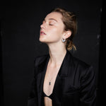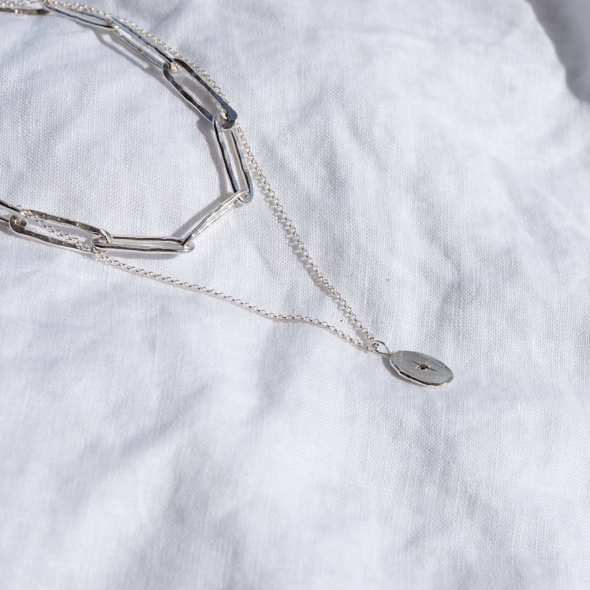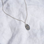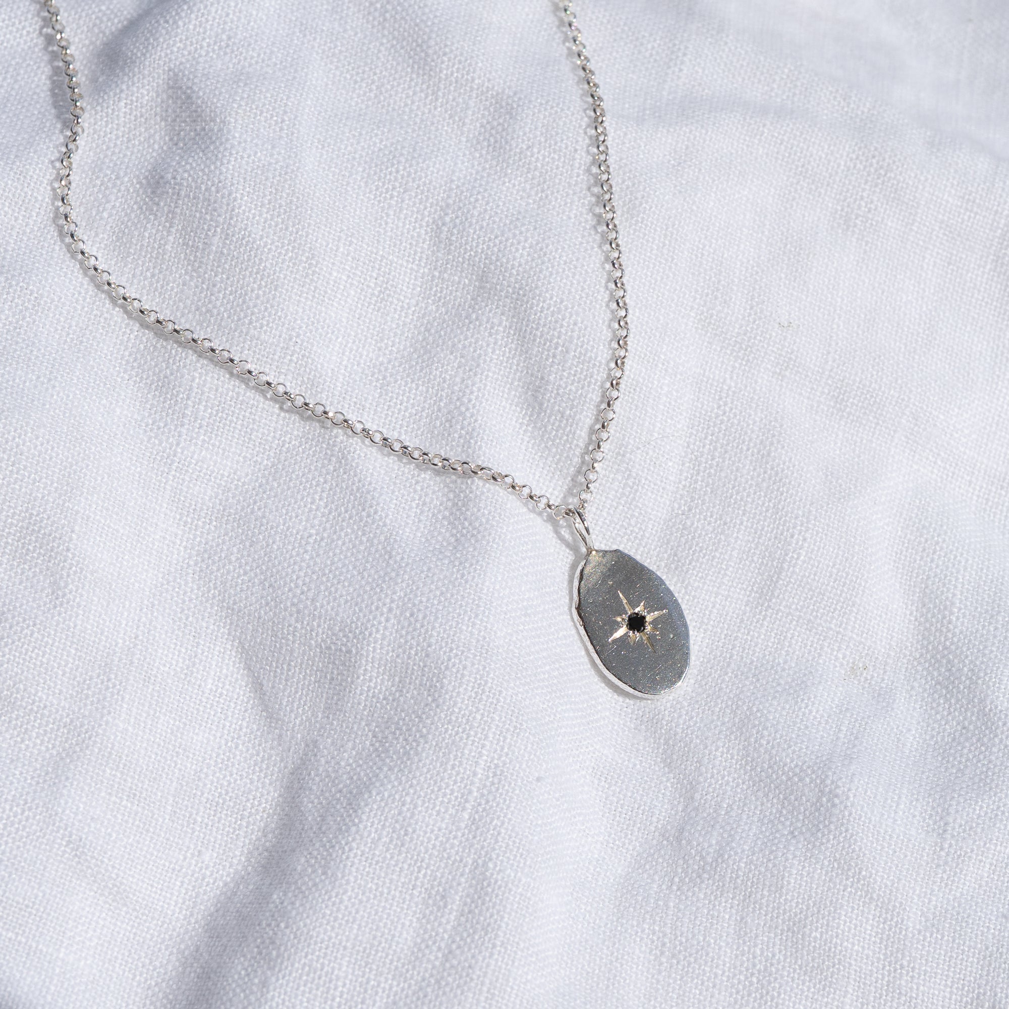 A single dot of recycled metal is rolled out into an organic oval shape with no trimming or refining of edges to accentuate and celebrate the organic metal form. A single black 2mm diamond is star set in the pendant.