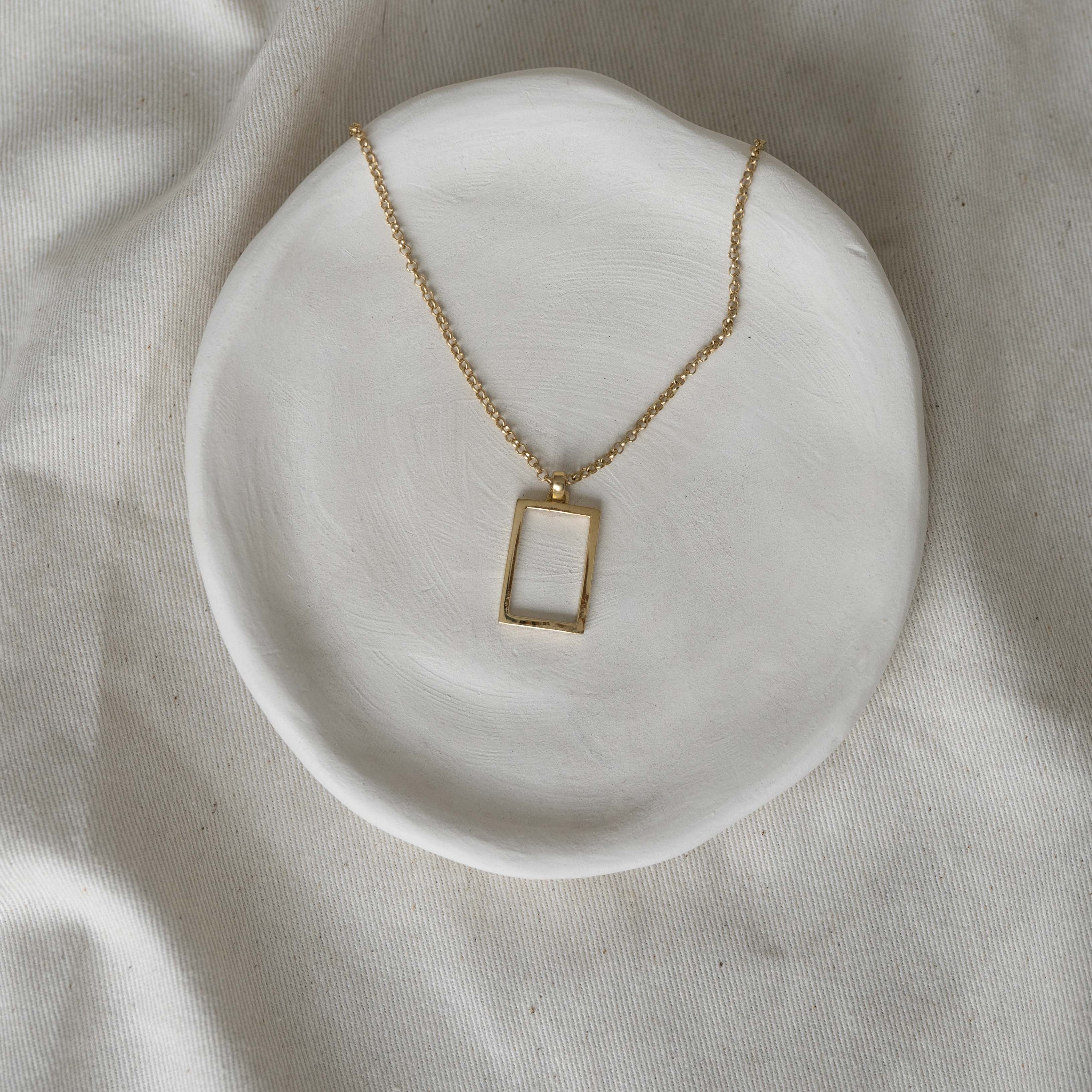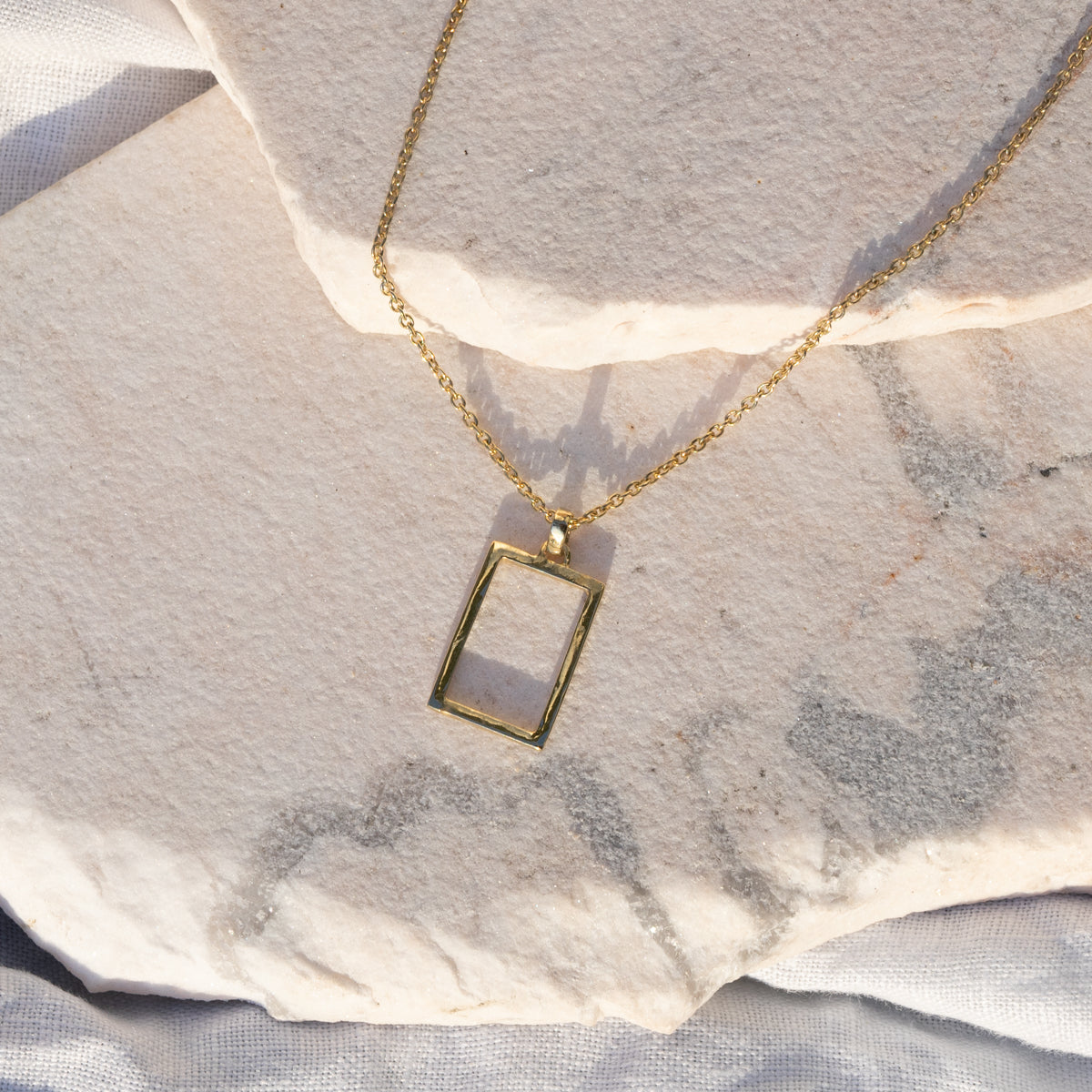 Handcrafted frame shape fashioned from 1.5 square sterling silver wire, hung on a 50cm chain and finished in a beautiful gold vermeil.