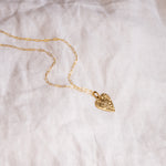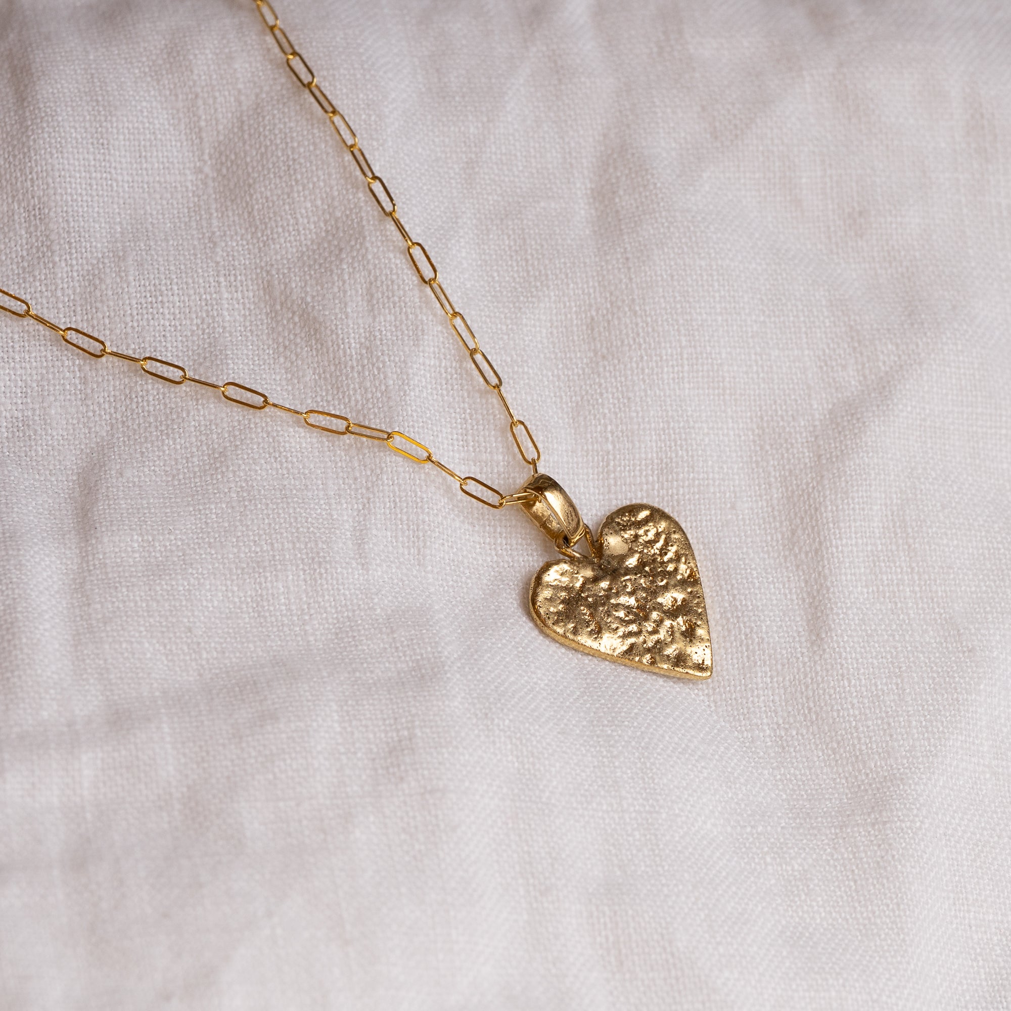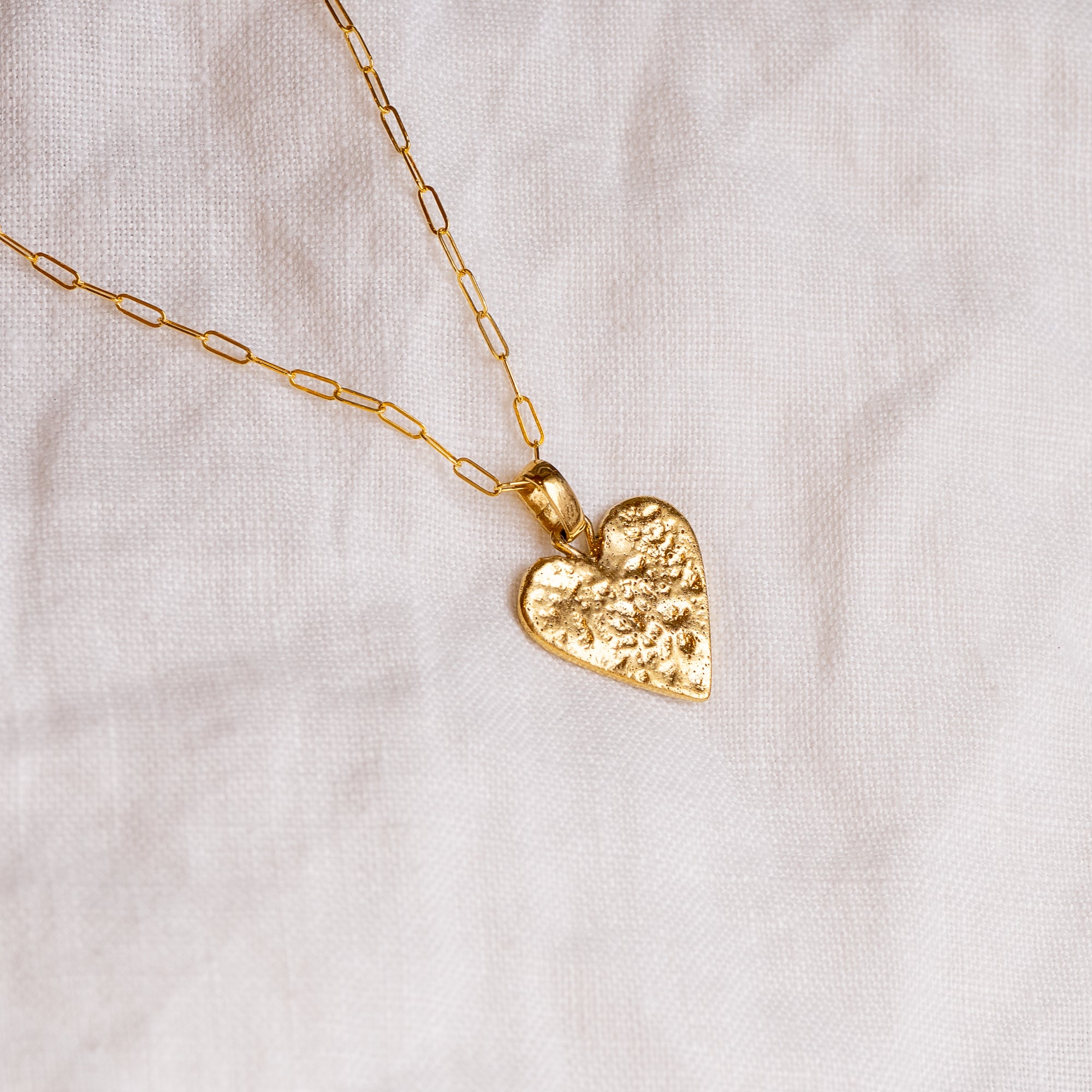 Gold Vermeil Textured Heart Necklace. 50cm 14ct gold filled paperclip chain.