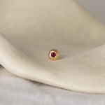 Individually melted stud that is 'crushed' just before it cools to form an individual misshapen dot, set with a 1.5mm natural ruby.