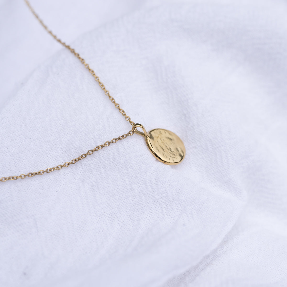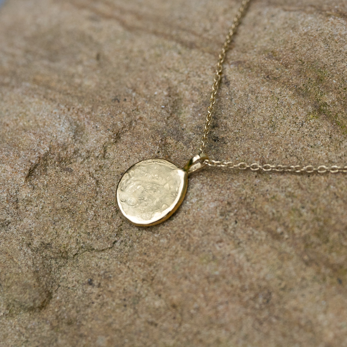 The natural coin necklace is the EWJ take on a classic style. Recycled gold is individually rolled into a disc shape with naturally undulating edges, each piece will be the same weight and roughly the same size but with its own imperfect edges and texture. Layer it up with other pendants or wear alone. Hung on a 45cm 1.3mm Belcher chain.
