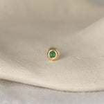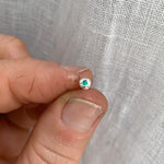 Individually melted stud that is 'crushed' just before it cools to form an individual misshapen dot, set with a 1.5mm natural emerald.
