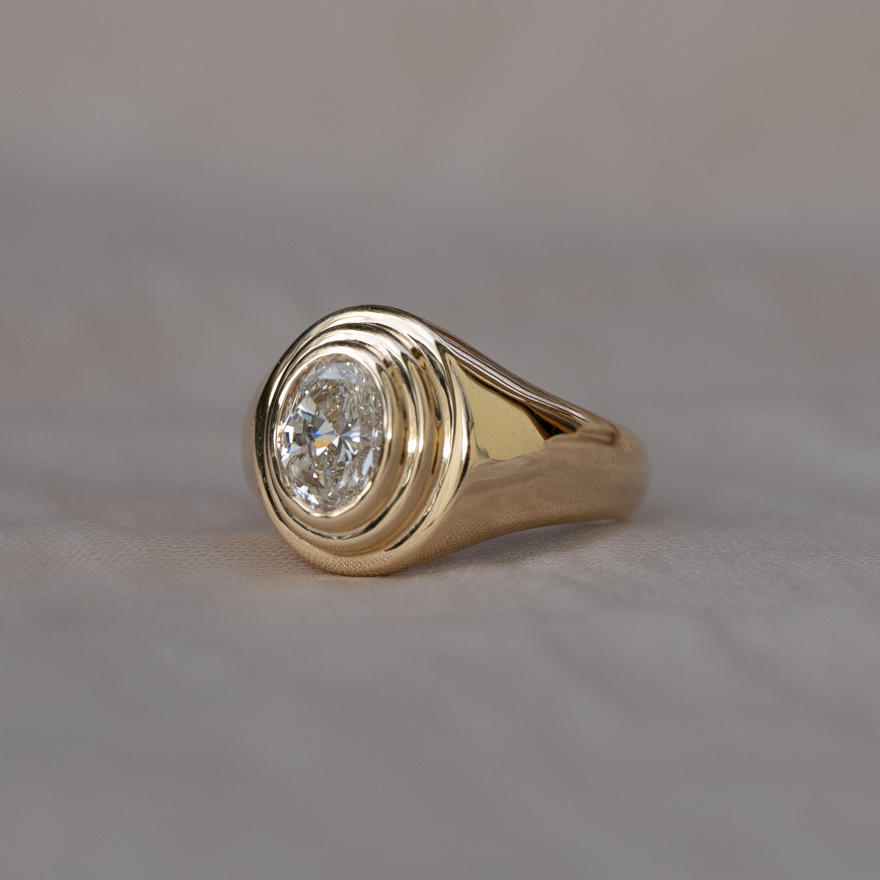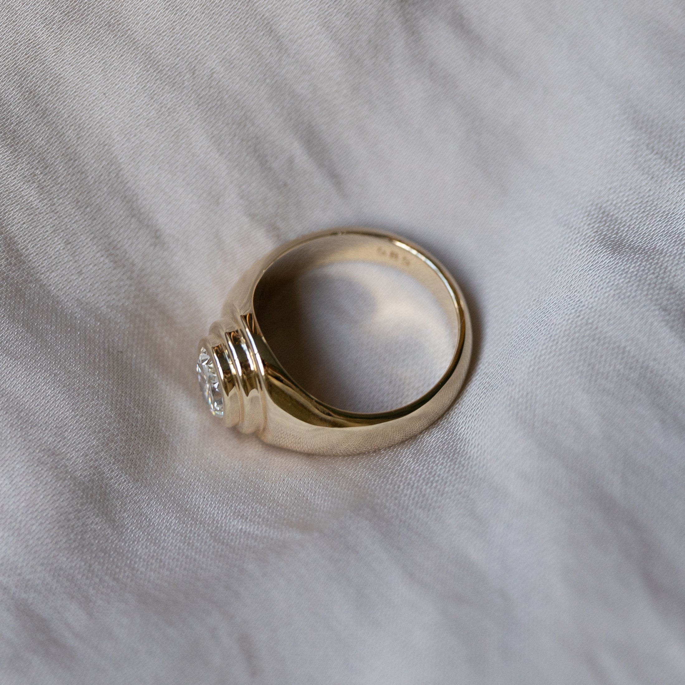 A stunning signet, highlighting the beauty and light of the bezel set diamond in the centre. A concentric stepped halo of gold mimics ripples on a pond - representing the echoes of special people, places and memories that we want to honour every day.