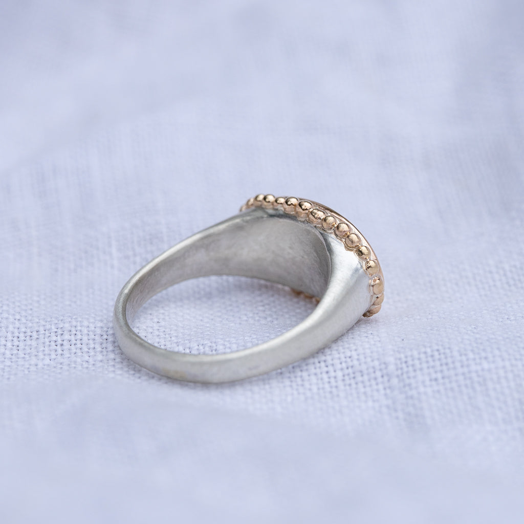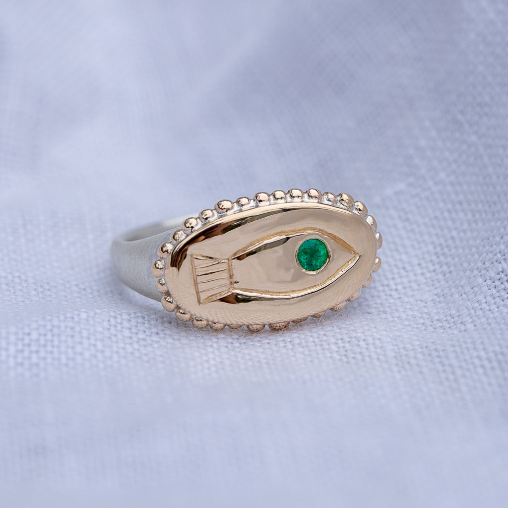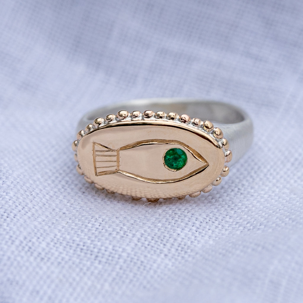Emerald Fishell is a handmade sterling silver signet with a solid 9ct Yellow Gold top with individually made gold granule border, all soldered individually.