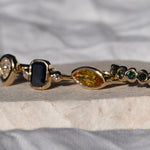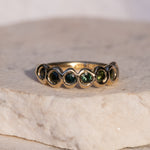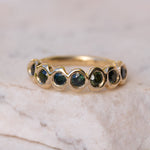 Seven gorgeous dark teal 3mm Australian Sapphires cast into recycled 14ct yellow gold. Gorgeous on it's own, or worn as an engagement or wedding band.